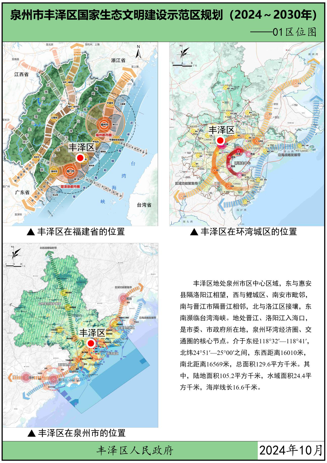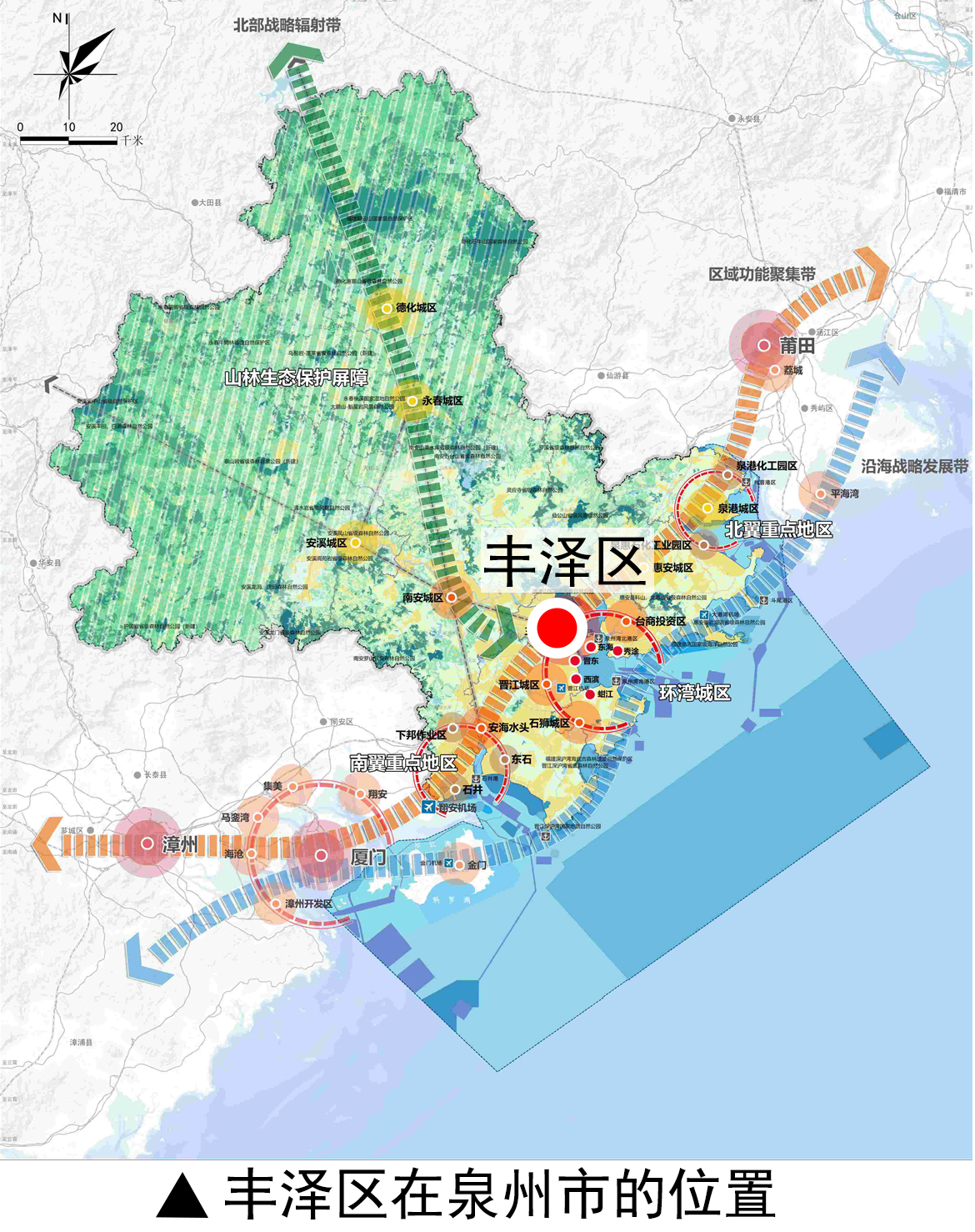 党中央明确支持福建探索海峡两岸融合发展新路,赋予“海丝”核心区、生态文明试验区等诸多先行先试政策,进一步凸显福建在全国区域发展格局中的战略地位。福建省正全方位推动高质量发展,做深做实新时代山海协作,奋力谱写全面建设社会主义现代化国家福建篇章。泉州市提出“全力打造具有全国影响力的海丝名城、制造强市,加快建设现代化中心城市”的战略定位,实施“跨江发展、跨域融合”战略,加快城市由散到聚。泉州先后获评全国文明城市、全国绿化模范城市、国家环保模范城市、国家园林城市、中国十大宜居城市、国家海洋生态文明示范区、国家森林城市、国家节水型城市,市本级和包括丰泽区在内的10个县(市、区)先后获得国家生态市、县、区命名,德化县、永春县、鲤城区获评国家生态文明建设示范县(区),全市建成111个国家级生态乡镇、1659个市级以上生态村,真正走出了一条生态“高颜值”、发展“高质量”的道路。生态文明建设“泉州样板”为丰泽示范区建设明确了方向。