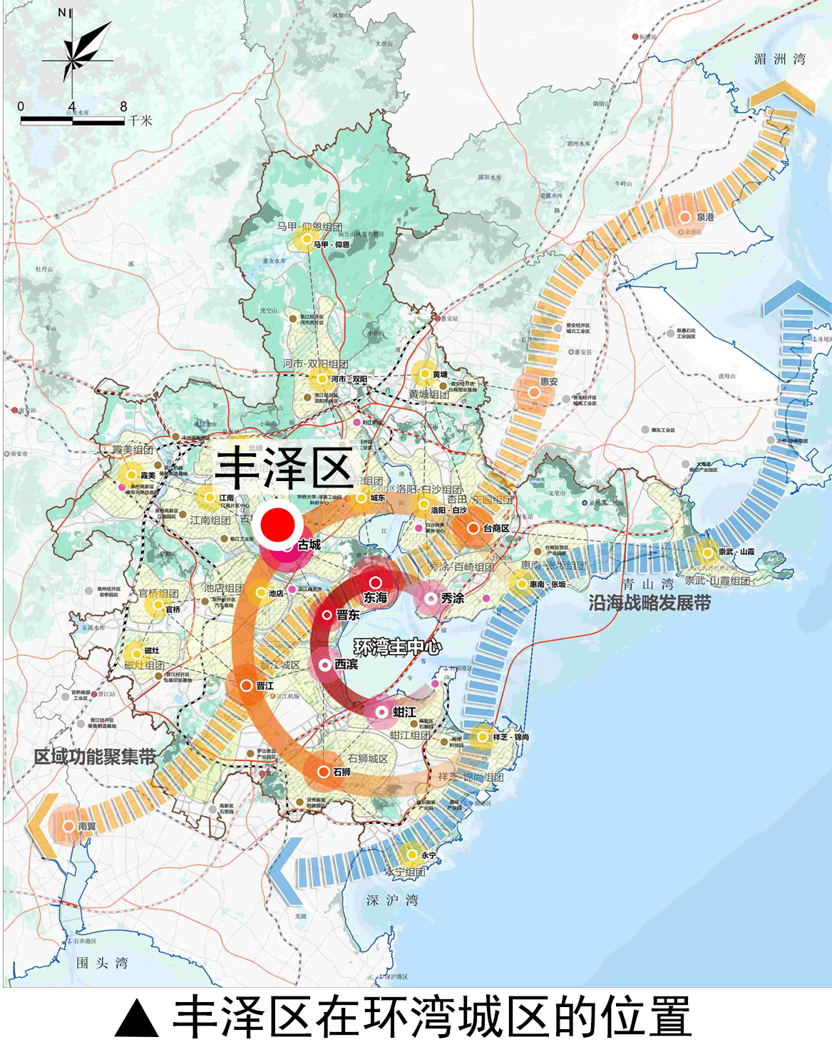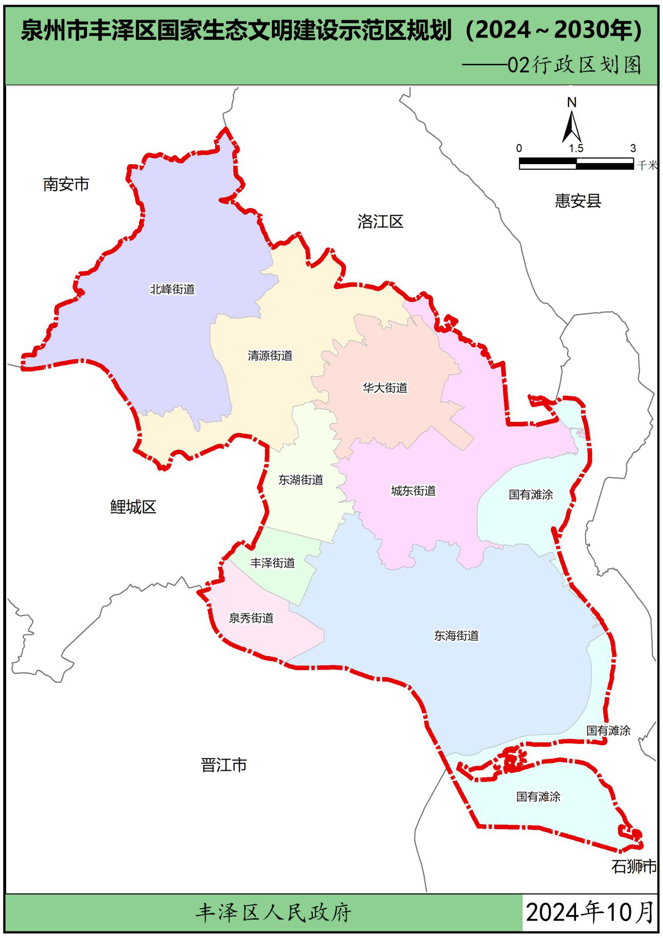 地理位置。丰泽区隶属于福建省泉州市,地处泉州市区中心区域,是泉州市委、市政府所在地,是泉州环湾经济圈、交通圈的核心节点。丰泽区位于晋江下游北岸、洛阳江下游南岸,东与惠安县隔洛阳江相望,西与鲤城区、南安市毗邻,南与晋江市隔晋江相邻,北与洛江区接壤,东南濒临台湾海峡。总面积129.6平方千米,其中,陆地面积105.2平方千米,水域面积24.4平方千米,海岸线长21.26千米。