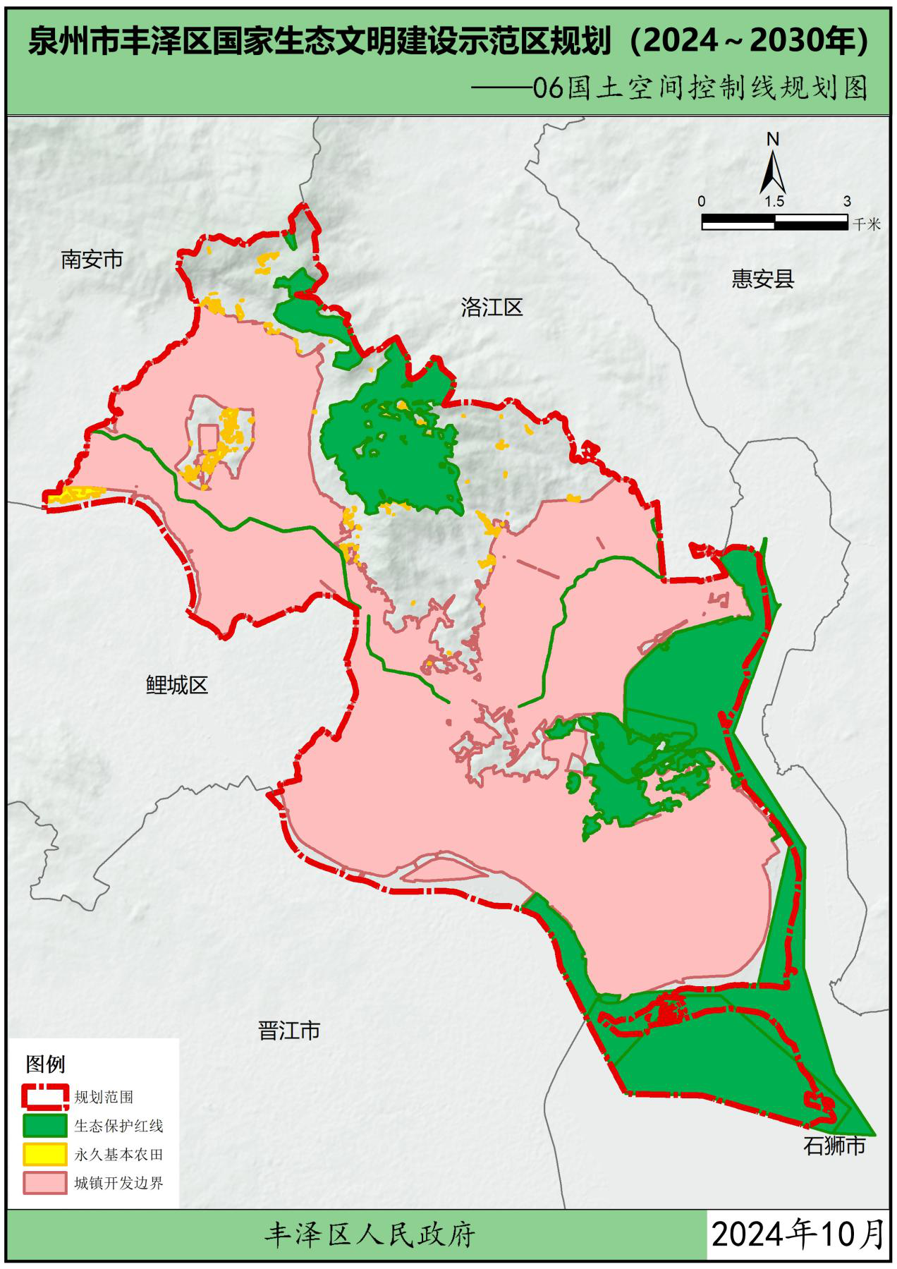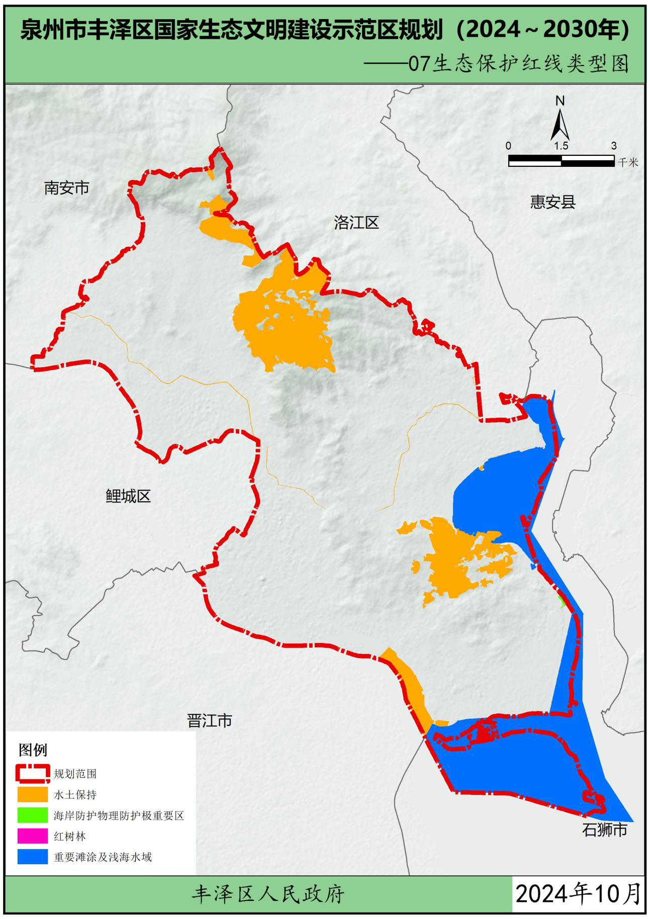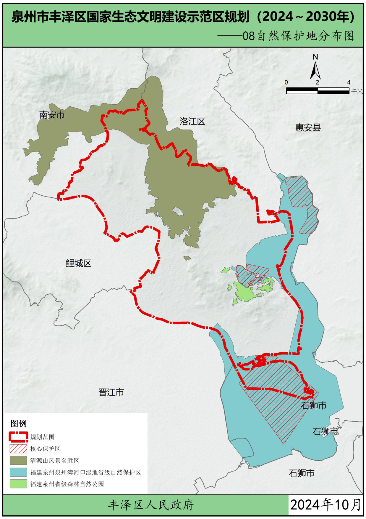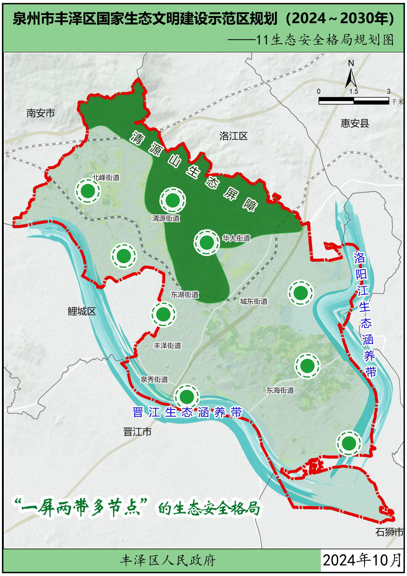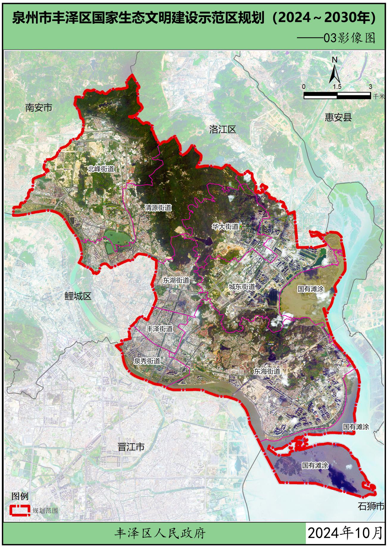 为贯彻党中央、国务院关于生态文明建设的战略部署,按照中华人民共和国生态环境部办公厅关于印发《国家生态文明建设示范区规划编制指南(试行)》的通知(环办生态函〔2021〕146号)以及关于印发《生态文明建设示范区(市)建设指标》《生态文明建设示范区(县)建设指标》《生态文明建设示范区管理规程》《“绿水青山就是金山银山”实践创新基地建设管理规程》的通知(环办生态〔2024〕4号)要求,在成人网站 、区政府领导下,结合福建省、泉州市生态文明建设工作实践及要求,立足丰泽区自身优势,丰泽区组织编制了《泉州市丰泽区生态文明建设示范区规划(2024~2030年)》(以下简称“规划”),规划围绕目标责任、生态安全、生态经济、生态文化、生态文明制度5大方面,制定了主要任务及重点工程。本规划是指导各街道各部门分类有序地把丰泽区建设成为生态优良、环境优美、发展优质的生态文明建设示范区的重要依据。规划基准年为2023年,规划期为2024-2030年。