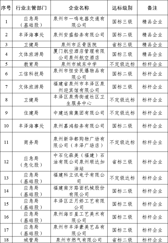 丰泽区2023年度“安全生产标准化精品(标杆)企业”名单