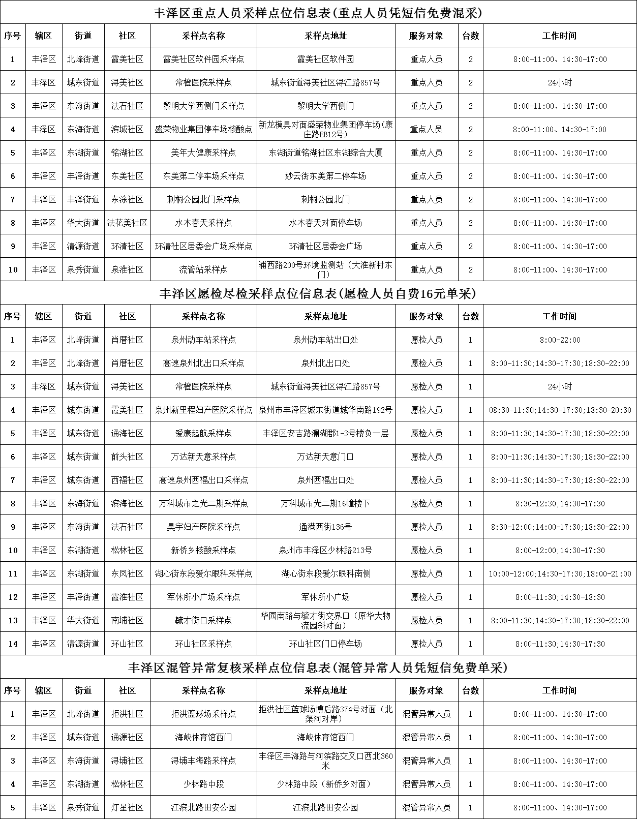 为进一步落实精准防控,丰泽区结合实际动态调整常态化核酸采样点,继续为重点人群开展“应检尽检”核酸检测免费服务;为满足其他居民群众工作、生活、出行等需要,新增“愿检尽检”自费采样点;同时,因近日常态化采样点频繁出现混采异常,混采管中部分人员未能及时出具检测结果,为减少混检追阳对群众造成的不便,自12月15日起,全区分类设置重点人群、“愿检尽检”人员和混管异常复核采样点(采样点详见附表),具体如下: