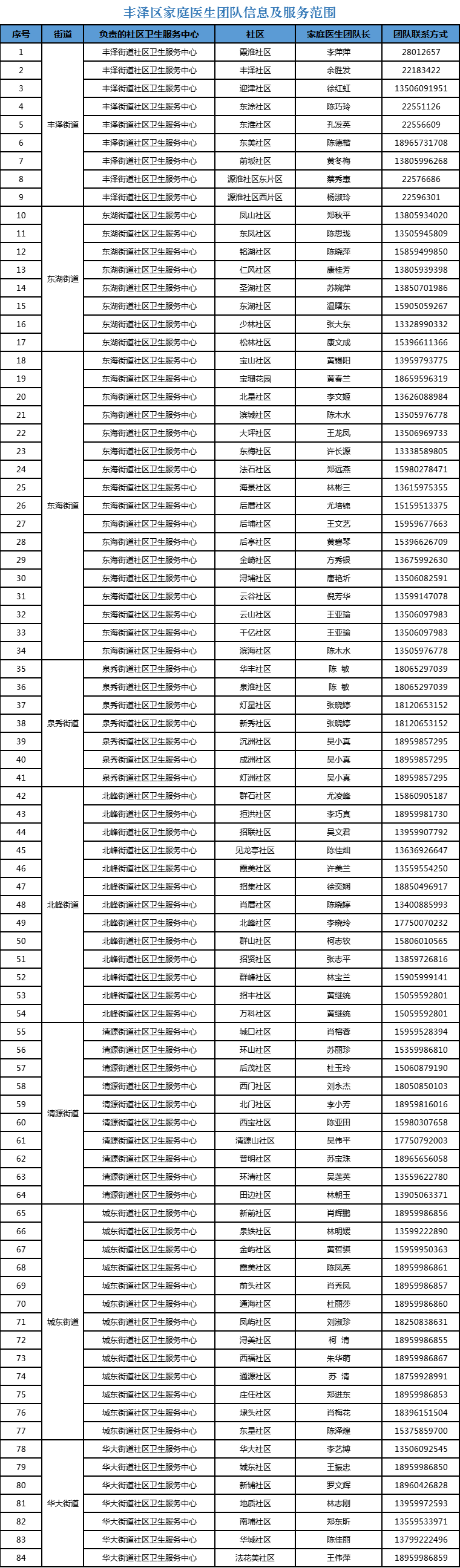 为切实当好“社区健康守门人”,更好地帮助和指导辖区广大居民做好自我健康管理,及时解决遇到的常见健康问题,引导广大居民做好自我防护,丰泽区卫生健康局向社会公布本区84个家庭医生团队信息及服务范围。如居民有相关健康问题,请拨打家庭医生团队联系电话进行咨询。