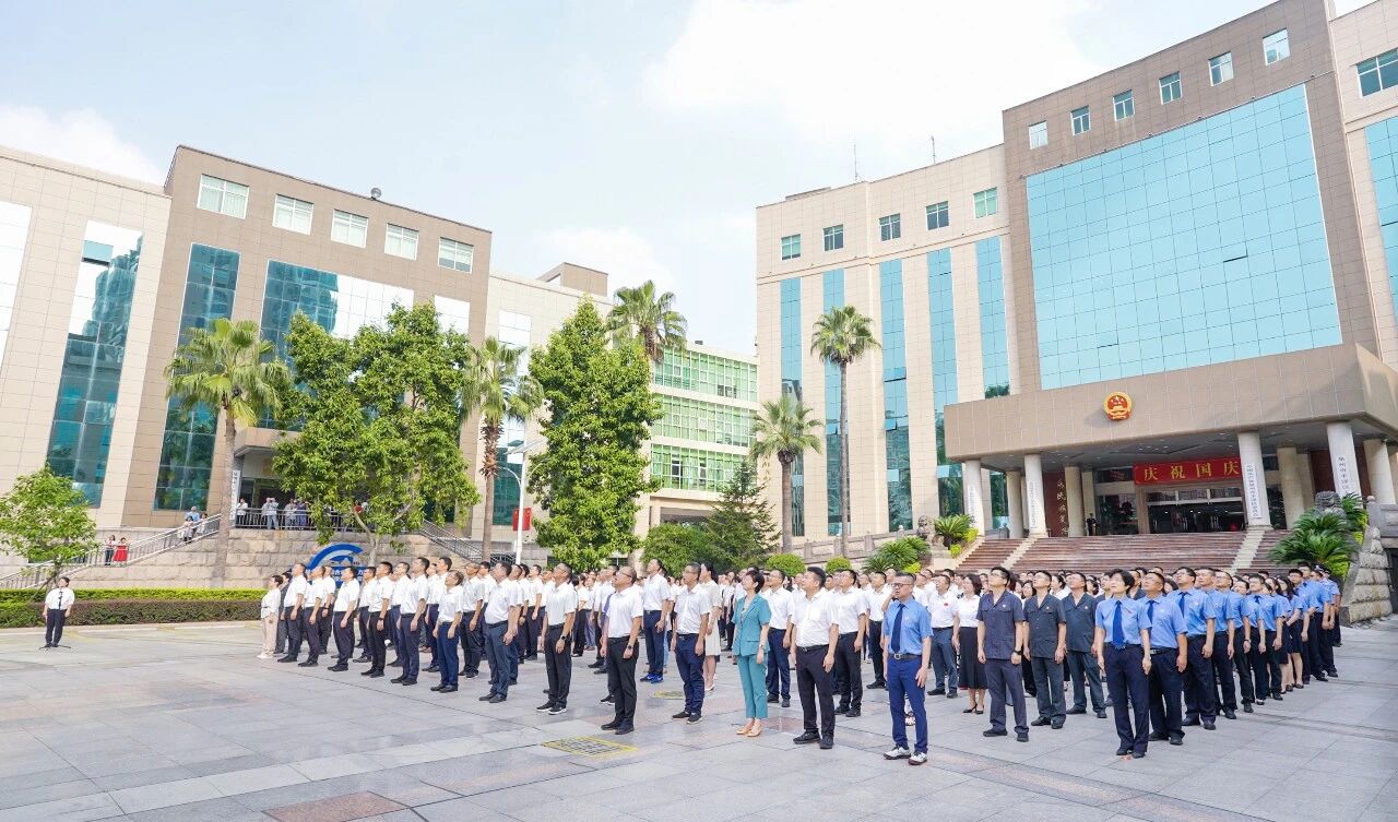 全体人员精神饱满、庄严肃立,面向国旗行注目礼,齐声高唱国歌,共同表达对祖国的深切热爱与美好祝愿。