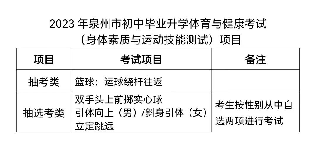 根据《教育部办公厅关于做好当前疫情形势下学校体育工作的通知》(教体艺厅函〔2023〕4号)精神,为更加安全有序开展今年体育中考测试工作,经综合研判,取消2023年泉州市初中毕业升学体育与健康考试(身体素质与运动技能测试)中必考类1000米跑(男)/800米跑(女)、200米游泳(泳姿不限)项目,相应成绩按满分15分计入学生体育中考成绩。抽考类和抽选考类项目按原公布项目进行,具体实施意见另行通知。