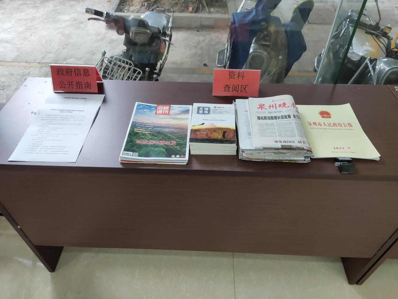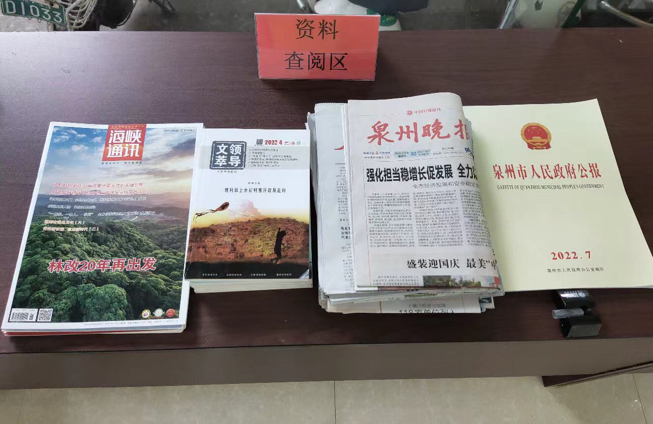 3.资料查阅区:于便民服务中心入口左侧配备政务公开资料展示柜,展示泉州晚报、福建日报、人民日报等党报党刊、2022年度政府公报、东海街道办事指南、各类政策宣传册等资料,资料分类摆放并定期更新,方便群众查阅。