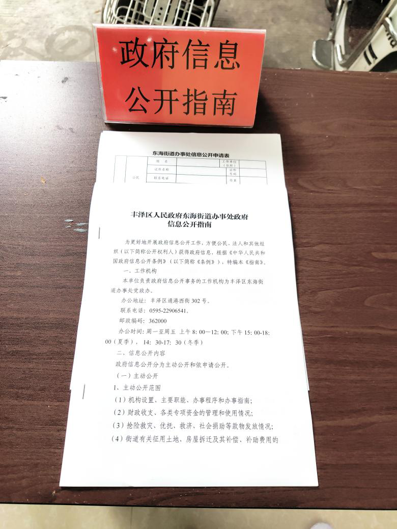 4.依申请公开接收区:提供东海街道办事处《政府信息公开申请表》样表,同时为群众填写信息公开申请表提供指导帮助和咨询服务。